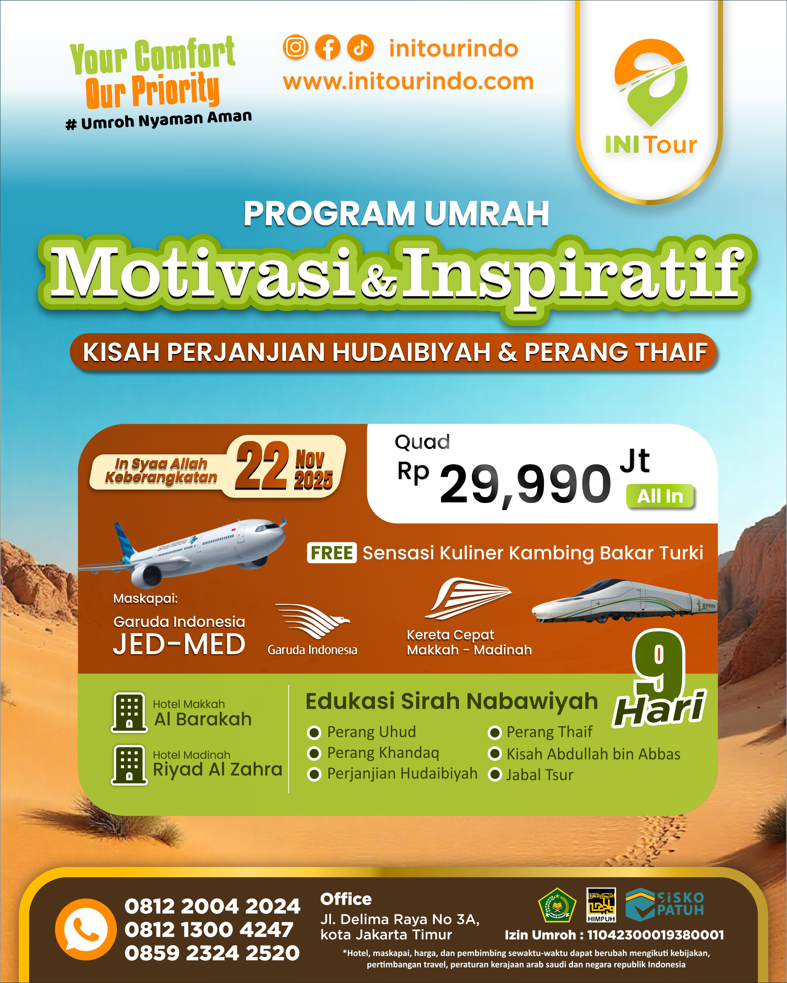 Kami INITour selalu ingin memberikan kenangan yang hangat dan berkesan di setiap perjalanan anda. Sebuah kehormatan bisa mendampingi anda menuju impian kaum muslimin tujuan kita bersama, dan dengan INITour kami menawarkan paket umroh eksklusif dengan melakukan perjalan yang akan menambah dedikasi pengetahuan tentang peradaban islam, sejarah islam di tempat-tempat tertentu, hingga sejarah keemasan kaum muslimin di dunia.
